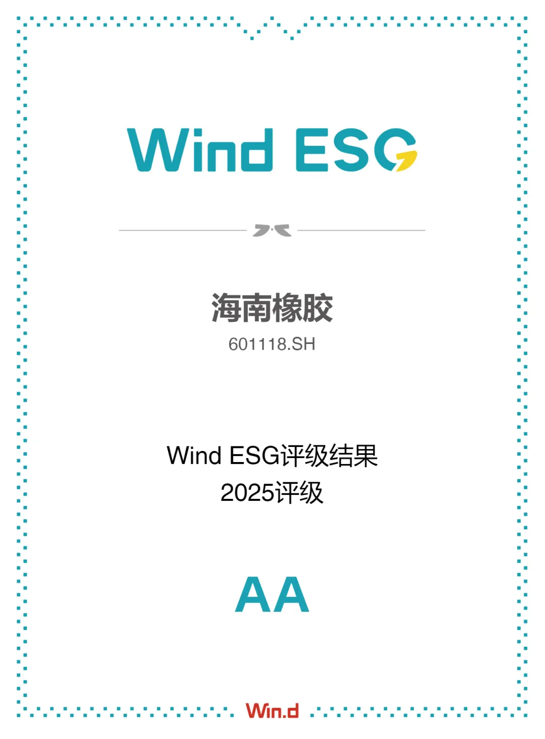 2025年6月,Wind ESG(萬得信息推出的環境、社會和公司治理評級體系)最新評級數據顯示,海南橡膠Wind ESG評級由A級上調至AA級,綜合得分排名位列所在紙與林業產品行業首位。